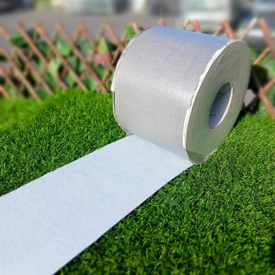 Et là, il vaut mieux être 2, un qui enlevé la protection de la bande et qui rabat les 2 morceaux de gazon dessus ...sans pincer les fibres, et l'autre qui "retient " le gazon pour aider celui qui colle.